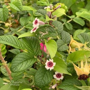 今日のお花 へクソカズラ𓂃 𓈒𓏸𑁍 ハマナスに上手く巻き付いて ゴワゴワ深緑の葉が へクソカズラの葉みたいに見えます➰🌿