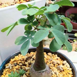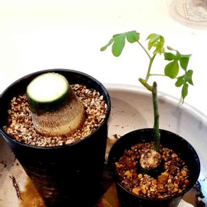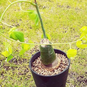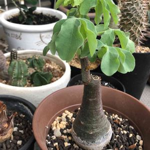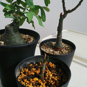 アデニアグラウカさん 剪定のその後 手前が5月の初めに剪定して挿し木した子 葉っぱは出てきました 発根は未確認です 右は昨年挿し木した子 無事に冬越しして葉っぱが繁って来ました 挿し木は塊根部が太らないらしいですが、年数経てば盆栽のように太らないかな? 左は昨年に続き今年も剪定された親分 剪定されても、もりもり葉っぱが出てます 頼もしい