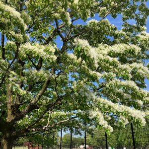 小さな公園の傍にある、大きなナンジャモンジャの木 ちょうど満開、風に揺れて光に揺れて✨ 別名 ヒトツバタゴ