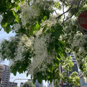 白い花が沢山ついていて、青空に清々しくて!なんという木なのか、知りたいな〜と呟いたら、隣で見上げていた方も、同じ事言ってた(^^)