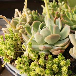 こんにちわ( ≧∀≦)ノ🎵 いいお天気ですが仕事です~⤵️ 今日は棚の奥の多肉ちゃん達を日向ぼっこさせてます🎵 この寄せ植え💧 ウッカリ同系色になってしまい なんだかパンチがありません⤵💦 もしかしたら 色が変わってくれるかも…と期待してますが(* ̄∇ ̄)ノヘヘヘヘ