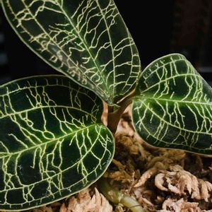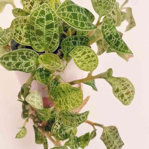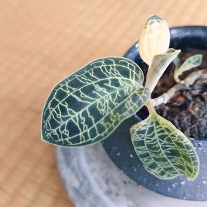 引き続き、わが家の美しい脇役✨ ジュエルオーキッド。 夏は腰水、冬はアクリルケース内管理ですが、それでも湿度は足りていない模様💦 そして近年、白い葉が出るようになりました。だんだん緑になるので放置していますが、これ良くないのかな? 未だにベストな環境がわからない🥲