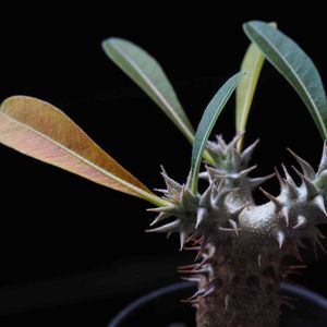 アデニウム・オベスムでおはようございます◎ 日当たりの良い室内管理で冬でも葉っぱモサモサです🌿 「砂漠の薔薇」とも言われるオベスムくん。 このズングリムックリなボディとは裏腹にハイビスカスのようなお花を咲かせます🌺 もうちょっと大きくならないと咲かないかな〜?