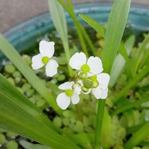 今日のお花 【オモダカ】 ナガバオモダカ 長葉沢瀉 「メダカの喜ぶ植物」の銘にて お迎えを 金魚やメダカと 睡蓮鉢にて 夏の風物詩 涼を 魅せて…。