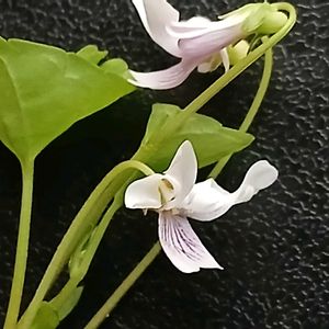 撮影4/29(①、②)、5/11(③) ツボスミレスミレ科スミレ属 北海道〜九州、屋久島まで分布 やや湿った樹林に被陰されない草地に生える 山間部では人里にも珍しくないが市街地にはあまり生えない 葉は丸っこい 基部は深く心形(3枚目) 葉は柔らかく緑色です艶がなく無毛で鋸歯あり 花色は白い4弁で反り返る 基部に紫の筋が入る 距は丸くて短い