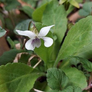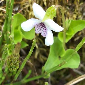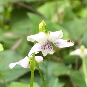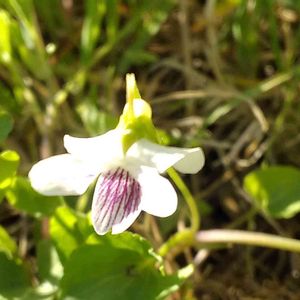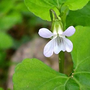 長く茎を出し白い花をつける ✜ツボスミレ✜ 1センチに満たない小さな可愛い花には紫色の筋があり葉はハート形です。 ニョイスミレとも呼ばれる可憐な花です(*˘︶˘*).。*♡