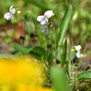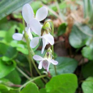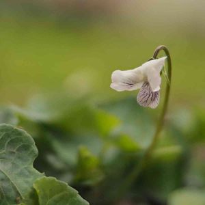 とっても小さいスミレ 『ツボスミレ』 平地や山地の林の下など、湿ったところに生える多年草(複数年のあいだ育成する植物)。名前のツボ(坪)とは、庭の意味。葉の形が僧侶の持つ仏具の「如意」に似ていることから「ニョイスミレ」の別名がある。花の直径は約0.8~1センチで、日本で見られるスミレのなかではいちばん小さい。色は白く、下の花びらに入る濃い紫色の筋がよくめだつ。