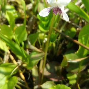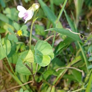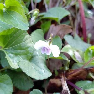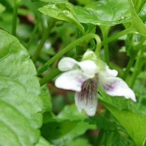 ツボスミレ (壺菫) タチツボスミレと同じ、有茎種のスミレになります。🏠の裏の休耕田に群生していました。壺とは庭の事ですが、庭ではほとんど見かけません。 花径1㎝ほど、距は丸く短い。葉は心臓形で縁に浅い鋸歯が有ります。 花色は白で、唇弁に紫色の線が目立ちます。これ☝️は何故か、紫色が強く出ています。 別名:ニョイスミレ (如意菫) 。この如意とは、僧侶が持つ仏具の一種で、葉の形が似ている事に由来します。