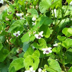 ツボスミレ(坪菫) 別名:ニョイスミレ(如意菫) スミレ科の多年草。 ・ごく小型で、長く茎を出し、花色は白で、上弁は反り返る ・花弁は小型。下弁に紫の筋が入る ・距は丸くて短い。 ・葉は丸っこく、基部は深く心形になるので、全体としては きれいなハート形の葉 📷2019/4/9 裏高尾
