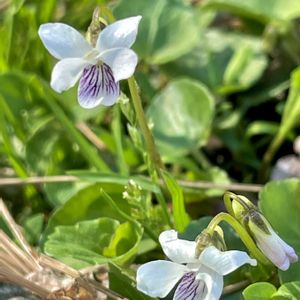 白いちっちゃなスミレに会いました 覚えたばかりのコミヤマスミレ? と思ったけど この前教えてもらった萼片の特徴が違うよね〜 あなたはだ〜れ? ・茎はある ・葉っぱの形はハート型 裏の色は少し紫 ・体に毛はない ・花は白色で小さい 唇弁の紫色のすじが目立つ ・側弁の内側は毛がある ・距は白色 短くて丸い ・柱頭の形は、カマキリ型 ・萼片 反り返らず毛はない ・場所 乾いた山地 ・ツボスミレ(ニョイスミレ)かな? 紫の小さなスミレ(あなたもだ〜れ?)と一緒に咲いていました またまた よろしくお願いします🙇 ツボスミレと教えていただきました ありがとうございます♡