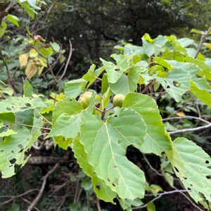 ★ 食べて遠くへ運んでシリーズ には 該当しないようなんですよ たぶん シナアブラギリ 支那油桐 1/2 間違っていたら教えてください。 トウダイグサ科アブラギリ属の落葉高木 中国原産 帰化種 本州関東地方南部以西の暖地で栽培されていたものが野生化 去年10月下旬に 出会いました。 ⬆ 上 緑色〜ちょっとピンクっぽく変化している まだ若そうな果実。わりと大きくて 5〜6cmくらいあるかな。 スマホの限界。ボケててスミマセン ■ 真ん中 その頃の葉っぱ。 私の手と同じ位の大きさで、もっと大きなのも ありました。 ⬇ 下 時間をおいてまた観察に行ってみました。 この写真は 11月半ばです。 黄葉してきています。 お名前がわかるまで かなり時間かかってしまいました… だってね、AIに尋ねたらゼンゼン違うじゃんって答えを出してくるんです。 イイギリの葉っぱに似てるんだよなーってところから … ようやく辿り着きました。 ・・・・2/2 につづきます。 撮影 2021 10/23 スマホ 2021 11/14 北区赤羽自然観察公園 重力散布 ★ ぽとりと落っこちるシリーズ ………………………………………………… 葉の形は、生育する環境や成長具合によるのか、ハート型タイプ・卵型タイプ・2~3裂するタイプがあります。 長さ(5~)10~25㎝ 幅(3~)8~20㎝