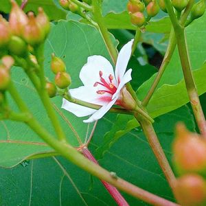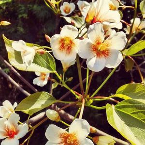 こんにちは♪ 新宿御苑の花散歩 🌸支那油桐(シナアブラギリ)🌸 トウダイグサ科 落葉低木 花期4月 実🔴10〜11月 花は白色で基部から赤褐色〜橙色の筋が入る。 種子油(桐油)は工業油として油紙や印刷インキ、家具の艶出しなどに利用される 花はほとんど落ちて高いところに数輪だけ咲いてました 初めましてのお花です