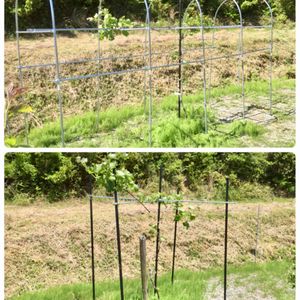 ぶどう棚 🔼新)ハウス資材で製作 🔽旧)あり合わせで製作 巨峰が大きくなってきたのでぶどう棚を製作しました😃 19mmのハウス資材にて製作😄 あとはビニール屋根を張って完成です😊 作業中に新芽を2本…折ってしまった😭 現在3年目の葡萄です👨🌾🍇