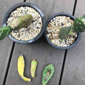アドバイスありがとうございました🙇♂️亀甲団扇の茎節をカットしてみました。 もぎ取ってから消毒したカッターでキレイにカット。 このままうまく乾いてくれればいいのですが、、、しばらくは日陰で養生します。 左の株は黄色く変色してしまった茎節が萎んできたのでカット。これは復活しなさそう。 右の株は急に黒ずみ始めた茎節をカット。希望を捨てずに乾いたら挿してみようかな😅 しかし、こうなってしまう原因がよく分からない、、、😓 定期的に自分ちの株を持ち寄っていろいろ情報交換したり、教えてもらったり、そんな場所があればいいのになぁ。😅