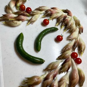 こんばんは プランター畑の農園主 気温が上がる前にボーボーの茗荷を成敗してました 小庭の西の通路に細長く、茗荷を植えてます 日陰で条件は良く、🌱毎年グングンと伸びます 雨続きで近寄りたくありませんでした チラリと覗くと食べ頃の茗荷ちゃんがポコポコ出揃ってました そこで、親分さんの🌱葉っぱたちを麻紐で縛りあげて収穫です 余りの狭さに腰を落とすと方向転換も難しく大変でした💦 軽く茹でて三杯酢で漬けます 🥒キュウリはこちらの2本でおしまい また、来年ヨロシクね💕 これにて私の本年度の野菜でお絵描きは終了です お付き合い下さりありがとうございました😊 美少女❓ 野菜女❣️ 🥒キュウリ 2本 🍅ミニトマト 6個 🌱ミョウガ 沢山