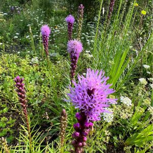 花畑のもふもふさん リアトリスの花が咲き始めました アゲハ蝶などの蝶々や、蜜を吸う昆虫が好きな花です💜 次々と見てる前で、甘いおやつを求めて訪ねて来ます🦋