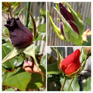 バラの蕾が色付いてきました☺️ 今年は開花が早いような気がします。 ⬅️ブラックバッカラ ↘️柿右衛門 冬に鉢増ししたので この春は蕾が沢山‼️ 秋に2つしか咲かなかったブラックバッカラは急成長しいて蕾10個確認できました。 柿右衛門も花が大きくなってます‼️