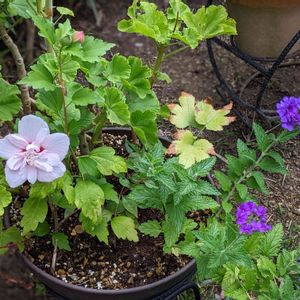 挿し木の寄せ植えです〜✨ 八重のムクゲが満開🈵蕾🏺も付いている!! 育てる喜び👏😄🎶 嬉しいなぁ〜🎉↗️