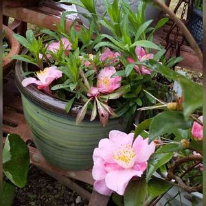 雨になりました🌧️ 香り椿「港の春」も終り近く… でも、下の鉢の撫子の中で咲いているよう🤗 椿は最後まで椿のまま・・・ 来年又会えますように・・・