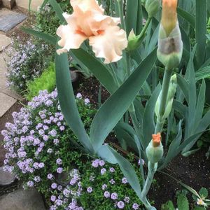 紫の 次に、 ソフトサーモン色?、 なんて言うのかな アプリコット色?の ジャーマンアイリス が 咲きましたよ❣️ 優しい色で、お鼻を 近付けると、微かに 香ります💓💕 朝から 庭で アマガエル🐸が 2匹 鳴き出しましたが、身体は 小さいのに 大きな声 でした〜❗️ 庭中に 響き渡りました。。。🐸