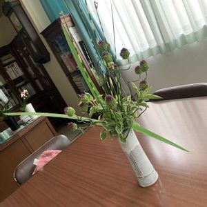 会議室生け込み 新緑の葉が美しいのでつい多めに入れてしまいますが、なかなか水上がりが難しいので、苦労します。 葉のグラデーションを楽しんでほしいと生けてみました。