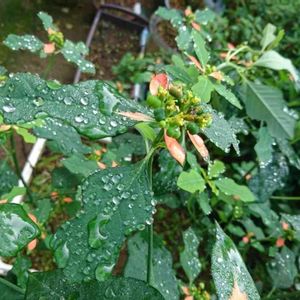 何て名前だったっけ?忘れてしまった?朝露キラキラ✨。 わかりましたありがとうございますショウジョウソウ(サマーポインセチア)です。