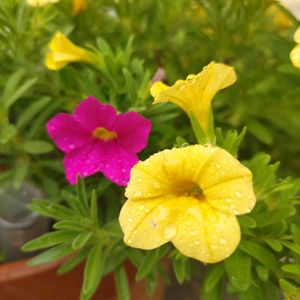 切り戻ししたらピンク色のお花さんがいなくなった。失敗〜(泣)でもまさかどしゃ降りの日に咲くとは。ピンクカリブラコアは最強だわ🤭