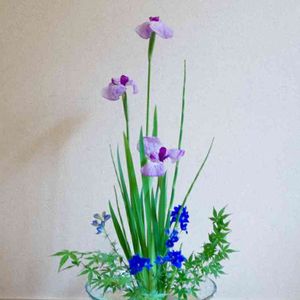 こんばんは😃🌃 昨日生けた自由花なのですが、本当はピンク系のお花も用意していたのですが、あまりにも暑かったので暖色を入れるのをやめてしまいました😃💦 色からでも涼を求めたいと思い、花器・花材もすべて寒色系でまとめました🎐 またまた庭の青もみじの出番です🍁
