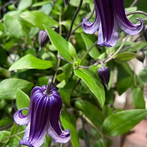 「クレマチス ロウグチ(篭口)」です💜 可愛い釣鐘型のクレマチス、大雨にも負けず、猛暑の中でも咲いてくれています✨ くるんとまいたすそがとってもキュート🎶 とても強くて、夏にこんなに咲いてくれて嬉しいです🥰