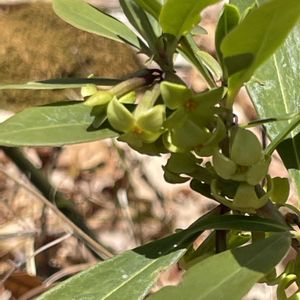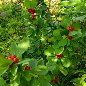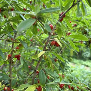 オニシバリ(鬼縛り) ジンチョウゲ科ジンチョウゲ属 落葉小低木 在来種 別名 ナツボウズ 樹皮が丈夫で鬼も縛れるほど強いという名前。 春の割と早い時期に黄緑色の花を咲かせていましたが、早くも真っ赤な実になりました。緑色の実と赤い実のコラボも素敵です。 2024 2/2に花を投稿しています。 今年は投稿していなかったかな🤔