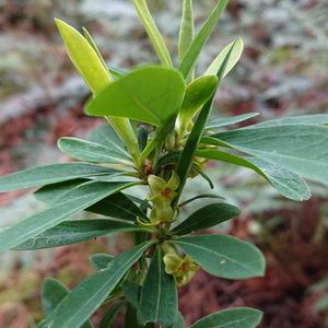 ふと見ると オニシバリの若い果実ができていました。 長径5mmほどの楕円形⚠️有毒 これから赤く色付いていきます。 夏に落葉します。(別名ナツボウズ) (花と赤い果実は今年2/22に投稿しています)