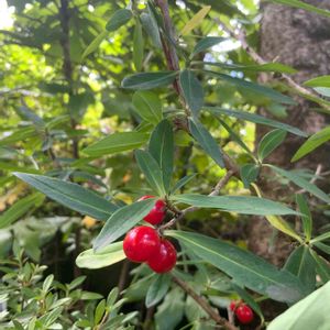 オニシバリ/ナツボウズ(夏坊主) 実になってました🍒 3月初旬に見つけた緑色の花が、ツヤツヤ可愛い赤い実になっていました♪ あまのじゃくなこの木はこれから落葉が始まり…夏にはすっかり坊主になるようです👨🦲🌿