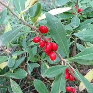 教えて❗️何の実⑨ 里山で出合いました。 細長い葉っぱに、たくさんの赤い実です