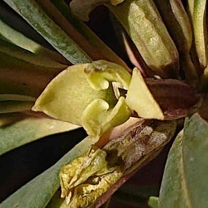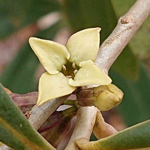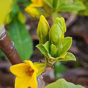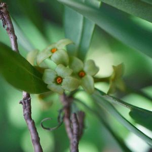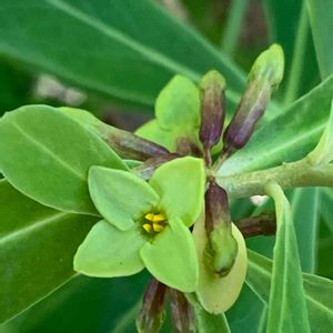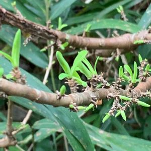 2月11日撮影 耕心館 鉢植えになっていました。 葉と蕾のつき方がちょっとジンチョウゲに似ています。 でも草っぽい。札が付いていました。 「鬼縛り(ナツボウズ)」 オニシバリ(ナツボウズ) ジンチョウゲ科ジンチョウゲ属 高さは1-1.5mになる。枝はよく分枝し、汚灰茶色で全体が無毛。葉は互生し、半革質でやわらかく、形は長楕円形で長さ5-13cm、幅1-3cm、両端は長鋭形になる。葉の縁は全縁で、7-9対ある側脈が不規則に分枝し波曲する。葉柄はほとんどない。7-8月頃に落葉し、8-9月に枝端から新しい葉と翌春の花の蕾が生える。 雌雄異株。花期は2-4月、花は淡黄緑色で、葉腋に束生状に2-10個つける。花弁にみえるのは萼裂片で、萼筒は長さ5-9mmになり、先が4裂し、長さ2.5-5.5mmの裂片は開出する。雌株の花の方がやや小さい。小花柄は花後、枝にいぼ状に残る。雄蕊は8個で、雄蕊上列は萼筒から少し出る。子房は無柄で楕円形になり、花柱はごく短く、柱頭は円盤形になる。果期は5-7月、径8mmほどの楕円形の果実をつける。果実は液果で赤く熟し、辛く有毒。 樹皮が強靭で、枝を折ってもちぎれないことから、この木の樹皮で鬼を縛っても切れないだろうという意味で、オニシバリ(鬼縛り)といい、また、夏に一時落葉することから、ナツボウズ(夏坊主)という。 (Wikipedia より) 初めて聞いた名前でした。 なんとなくスルーしてしまいそうになりましたが、花が黄緑色なんて、見たい!と思ったのと、 花ともさんが投稿されている花のお写真を拝見して、これは見なければ!!と思いました。 ここのは鉢植えでとても低かったですが、木本なのですね。大きくなったらどこかに地植えするのでしょうか? 楽しみがいろいろ増えています☺️忘れないようにしなければ😆