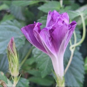 おはようございます👋😃⛅ 巨大輪朝顔💜江戸むらさき 何度も登場…すいません💦 💠手前の蕾の物語📖😊💠 ①手前の蕾が主人公です❇️ ②翌朝5時開き始めてました💠 ③7時、小さな瓶に活けてみました ④夕方6時まだ完全には萎んでなくて ⑤翌朝7時、ようやく萎みました… さて、このまま種が出来るかは…🙄 わかりませんが少し様子見です。 続く…かな?