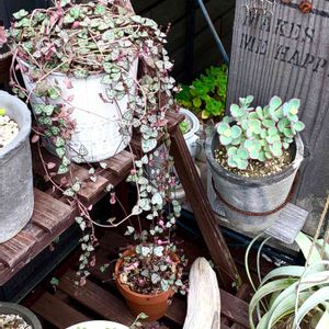 半日陰の場所に落ち着いたグリーン達😊 夏を乗り切ってね😣 ビアポップ アロマティカス ハートカズラ トラディスカンティア クリスマスローズ フランネルフラワー ポーチュラカウェルデルマニー ワイヤープランツ