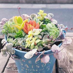 青い缶もかわいくできた♪ セダムをいろいろいれたので、もりもりしてくるかな♪