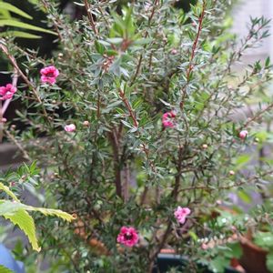 蒸れに弱いのと夏頃、翌年の花芽が付き始めるようなので梅雨前にバサバサ剪定しました。 ぽつり開花❁¨̮ ~マヌカ~(ギョリュウバイ) 7/10