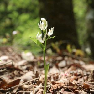 ユウシュンラン 高さ10~15cm 葉はほとんどが鞘状に退化するが、上部1個のみは普通の葉に近く1~2cm 花柄の基部に苞葉が1~2個ある。花は2~3個付き白色。半開状で長さ約1cm。ギンランに似ている。ギンランより小型。 1週間程前には40~50株あったそうです。最後の1株に会えて良かった‼️ 来年のお楽しみが増えました😄