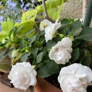 今日のお花 インパチェンス 去年の冬越し株の バラ咲きフィエスタ ホワイトです。 先日アップルブロッサムも 買いました🌸 上手に梅雨を乗り切って 秋まで楽しみたいです🤗