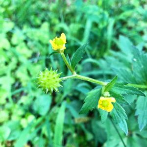 これは何の花でしょうか? 蛇苺の花に似てるけど、このトゲトゲした実はいちごではなさそうだ… 🤔???