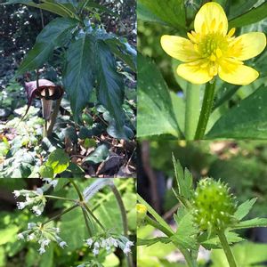 〝沖ノ島 ~散歩♫〟⑥ 島の小道のあちこちで顔を出している ~💛🤍🤎 右上…ケキツネノボタン(キンポウゲ科)…所々で黄色い花がポッ🌼 春だ~*\(^o^)/*✨ 左上…ウラシマソウ(サトイモ科)…釣り糸を垂らして不思議な姿 ~(o^^o) 若い株は雄花で ~なんと大きな株になると雌花になるんです(@_@) 性転換するんです‼️ 左下…ヤブニンジン(セリ科)…見分け方が⁇ でもヤブニンジンだと思う♡ 食べられるそう(o^^o)