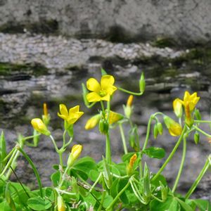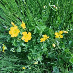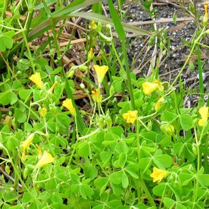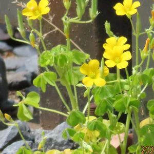 グランドカバーのハツユキカズラの間から、見知らぬ黄色い花がスッと立ちあがりたくさん咲いてる😅 調べてみるとオッタチカタバミ。