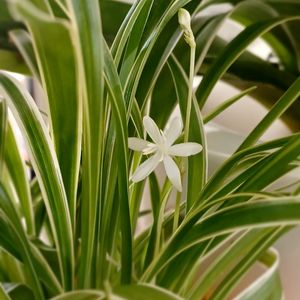 シャムオリヅルランの花が咲いてます🌸気がついたら咲いていて1日で萎んじゃうので、目が届きやすいキッチンのカウンターで育てています😊 シャムは寒さに弱いランナーを出さない品種。コンパクトなのでちょうど良いです🎵 ボニー、中斑、外斑、斑なしは置き場所がなくて外管理なので、葉っぱは無くなって根だけで休眠中💤