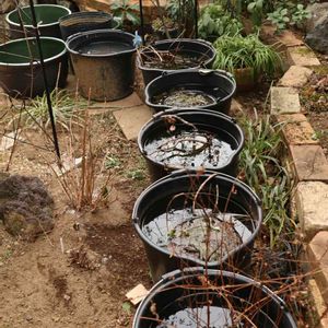 ビオトープ完成待ちの別風呂も満員御礼! ココと先程投稿したバケツ以外にまだタライが二つあって温帯睡蓮が眠ってますし、メダカのバケツもあって、ビオトープ製作中で避難中の植木や草花の鉢が狭い日向にひしめき合って、もう足の踏み場もない庭になりました! 絶賛庭崩壊中(笑)