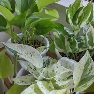 我が家のポトス3兄弟🥰 伸びてくると切って瓶の中。根が伸びると、土の中の繰り返し😄 最近仲間入りした、斑入りが素敵なマーブルクィーン💕但し、この子だけは、育てるのに大変だとか😅油断すると根腐れ、葉焼け‼️さすが末っ子😅 丈夫なポトスじゃなかったの❓