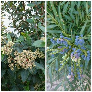 2019,02,19 最近のお庭。コバノガマズミの白い蕾。右はナリヒラヒイラギナンテンの実。ブルーベリーみたいに粉を吹いています。