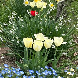 💙💙ネモフィラブルー💙💙 ネモフィラと🌷チューリップ 春を生きている感増し増し(^^) 近所の公園にて