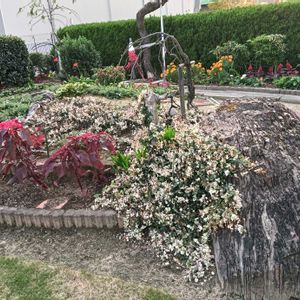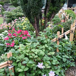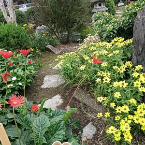 エミコのお庭です。 真ん中を芝生に場所 取りされ、、縁っ子 所狭し、お花を植えて います。