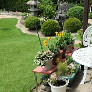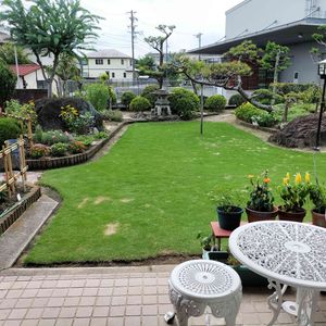私のお庭です。芝もグリーンが濃くなって来ました。。